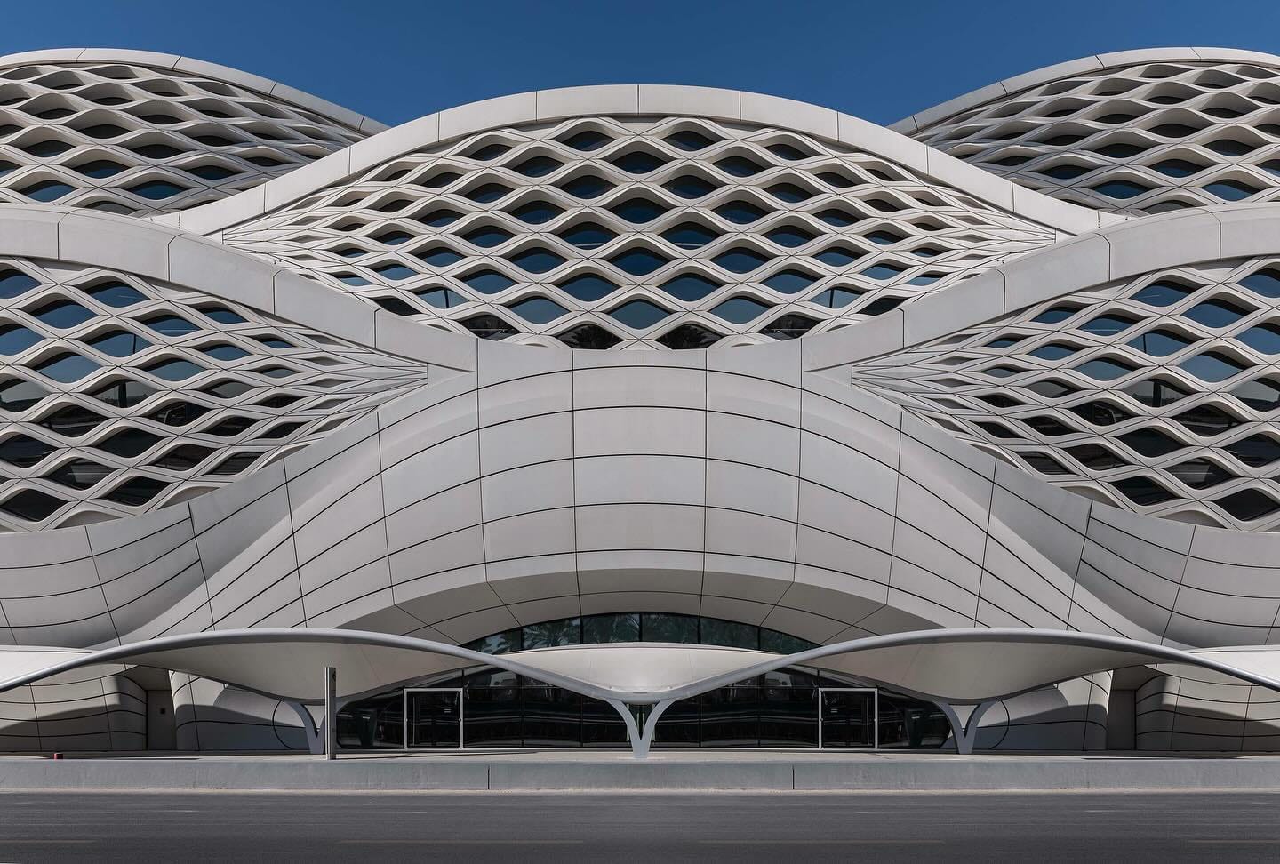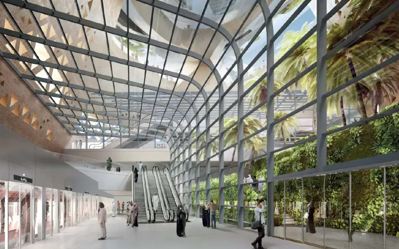 Designed by Zaha Hadid Architects, the King Abdullah Financial District Station covers 8,150 m² and serves Lines 1, 4, and 6. Its lattice façade is inspired by the rippling forms of desert dunes and the intricate geometry of mashrabiya screens. As daylight shifts, shadows dance across the walls, creating a dynamic visual experience.