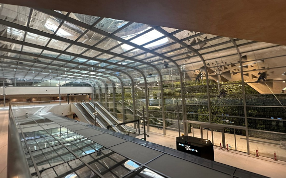 This 20,000 m² station reaches 40 m underground and spans eight underground levels, crowned by a 70 m-diameter stainless-steel inverted cone roof. Inside, a glass-enclosed garden creates a calming space while reflecting surrounding heritage architecture.